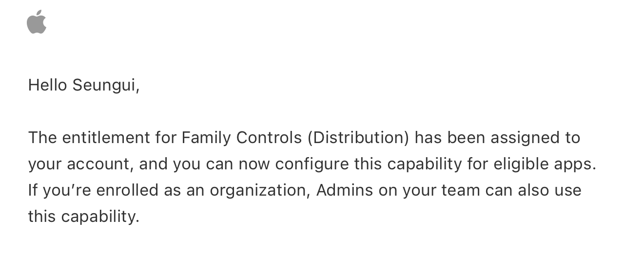 아래 이미지와 같이 Distribution 버전의 Family Controls가 추가되었다면 정상적으로 배포가 가능합니다. Xcode에 들어가시면 자동으로 FamilyControls(Distribution)으로 변경된 것을 확인할 수 있어요:)